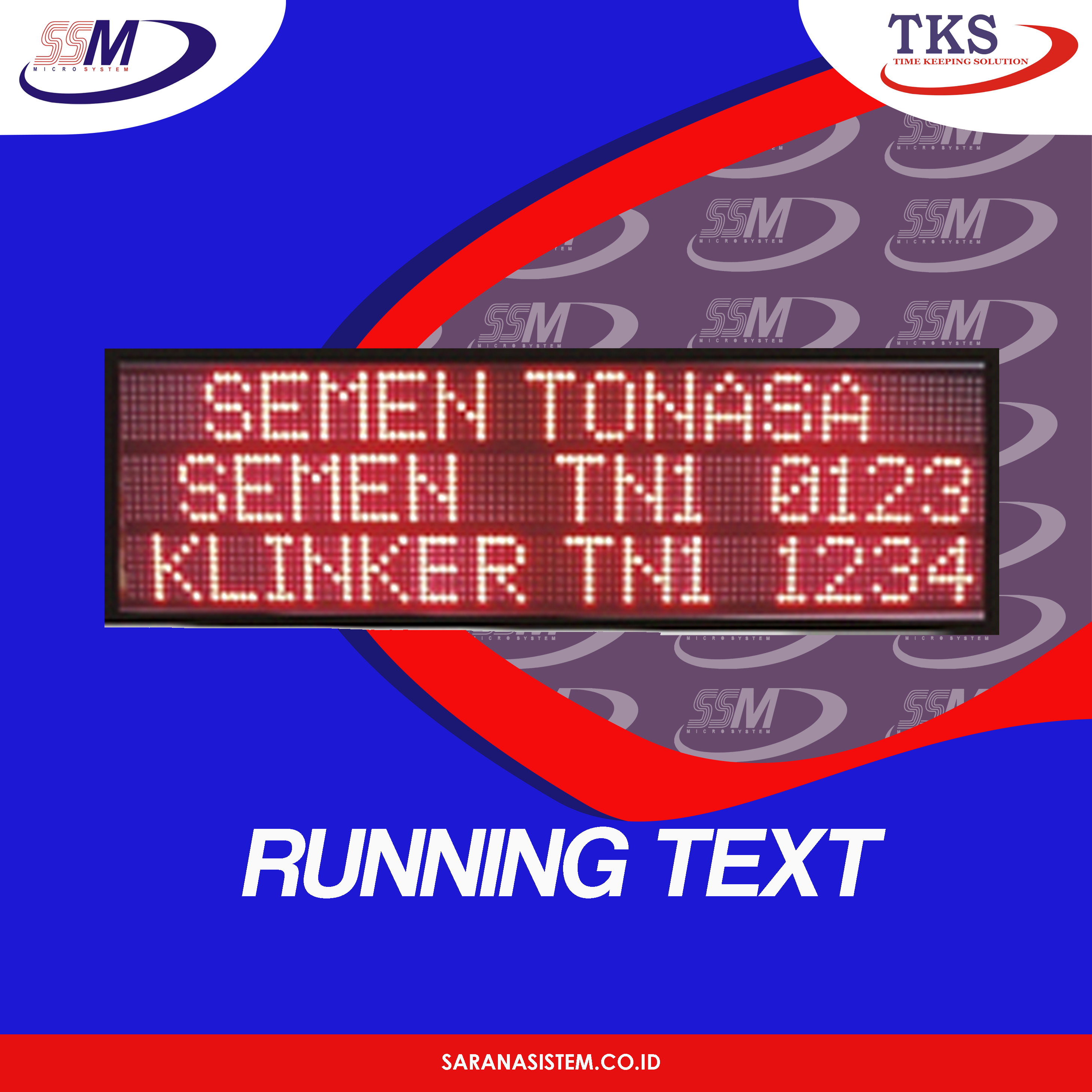 Running text adalah alat yang dapat menampilkan tulisan berjalan dalam bergai ukuran dan animasi sesuai dengan yang dikirim melalui software khsusu yang di install di computer atau HP. Running text dapat dipesan dalam berbagai macam ukuran dan warna baik untuk di tempatkan di out door maupun indoor.